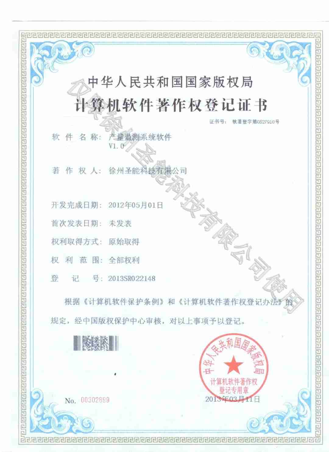 產(chǎn)量監(jiān)測系統(tǒng)軟件軟件著作權登記證書