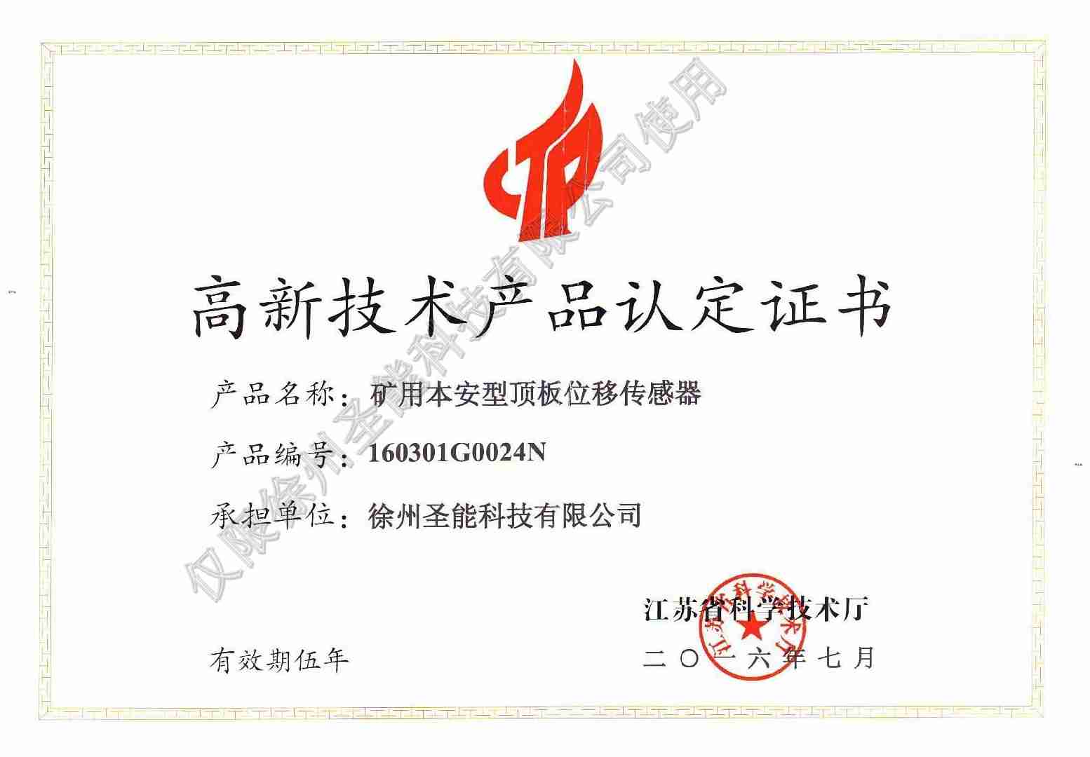 礦用本安型頂板位移傳感器認(rèn)定證書(shū)