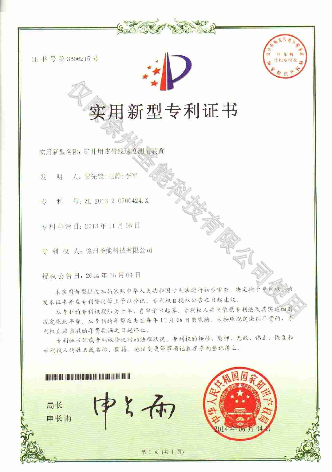 礦井用皮帶線速度測(cè)量裝置專利證書(shū)