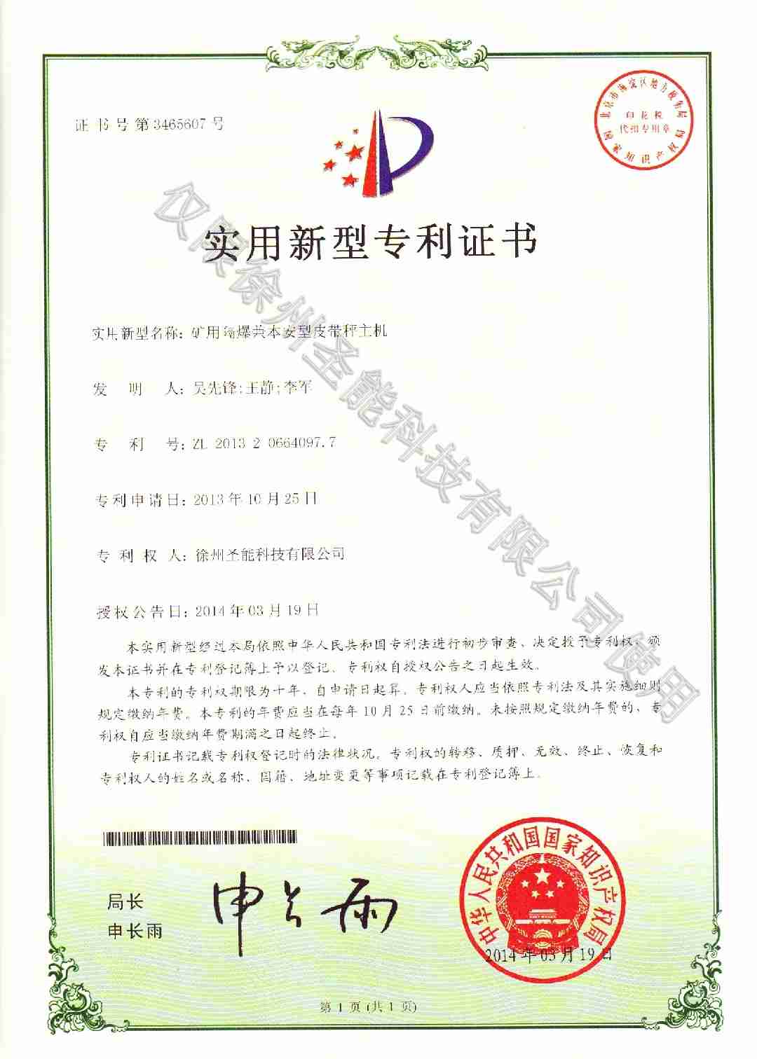 礦用隔爆兼本安型皮帶秤主機(jī)專利證書