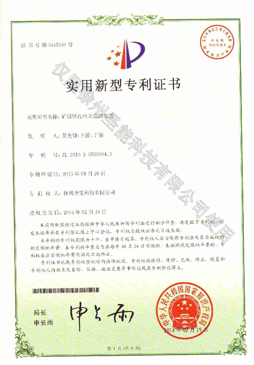礦用鉆孔應(yīng)力監(jiān)測(cè)裝置專利證書