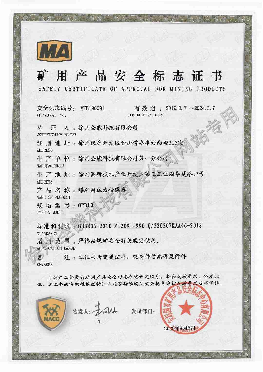 GPD10煤礦用壓力傳感器煤安證