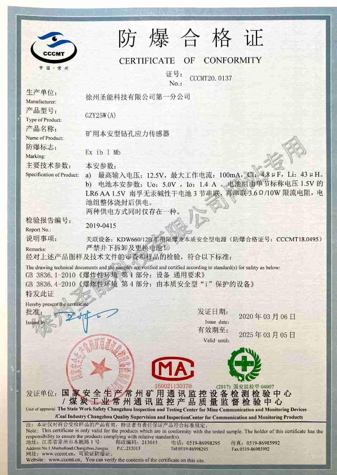 GZY25W(A)礦用本安型鉆孔應力傳感器防爆證