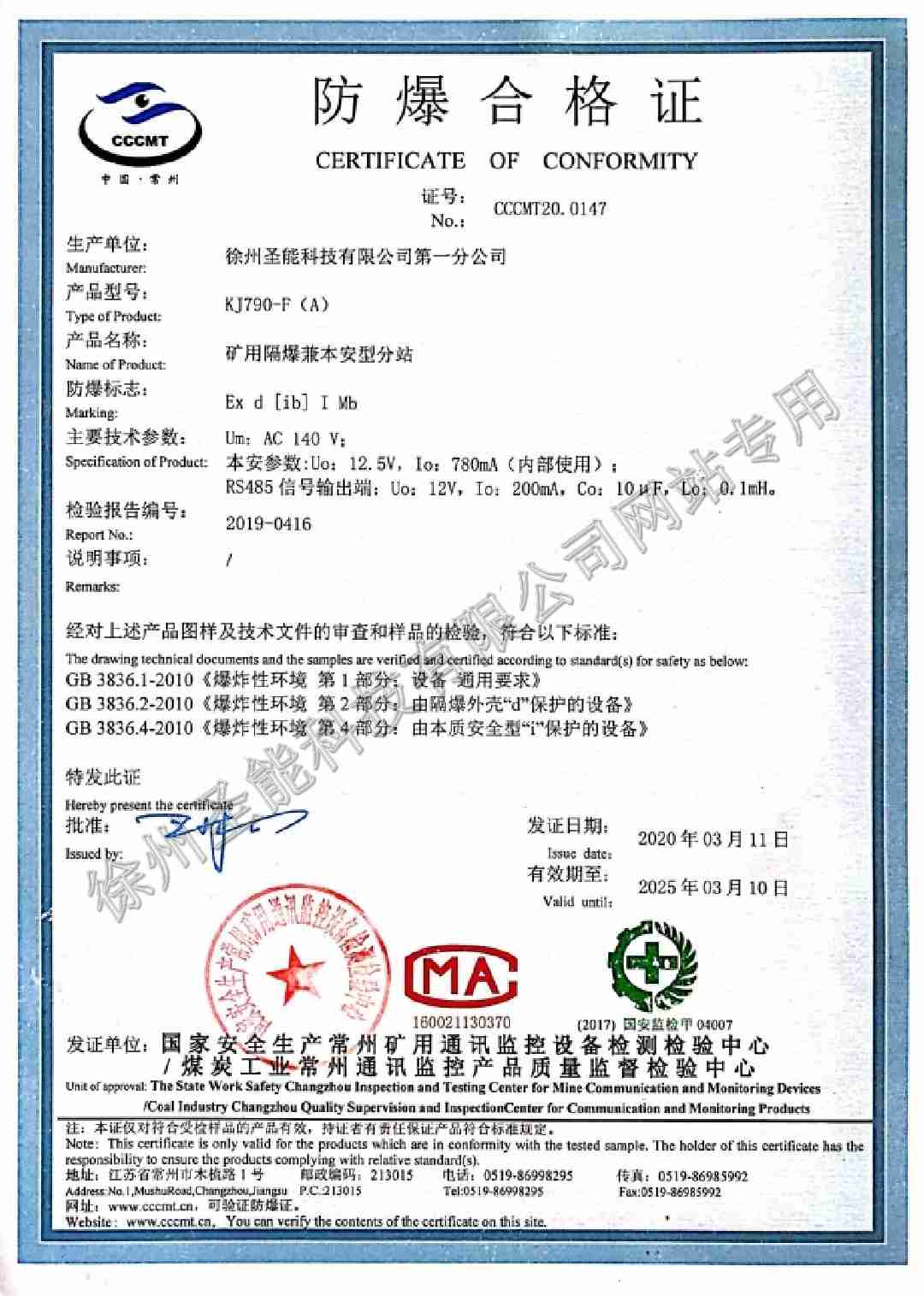 KJ790-F(A)礦用隔爆兼本安型分站防爆證