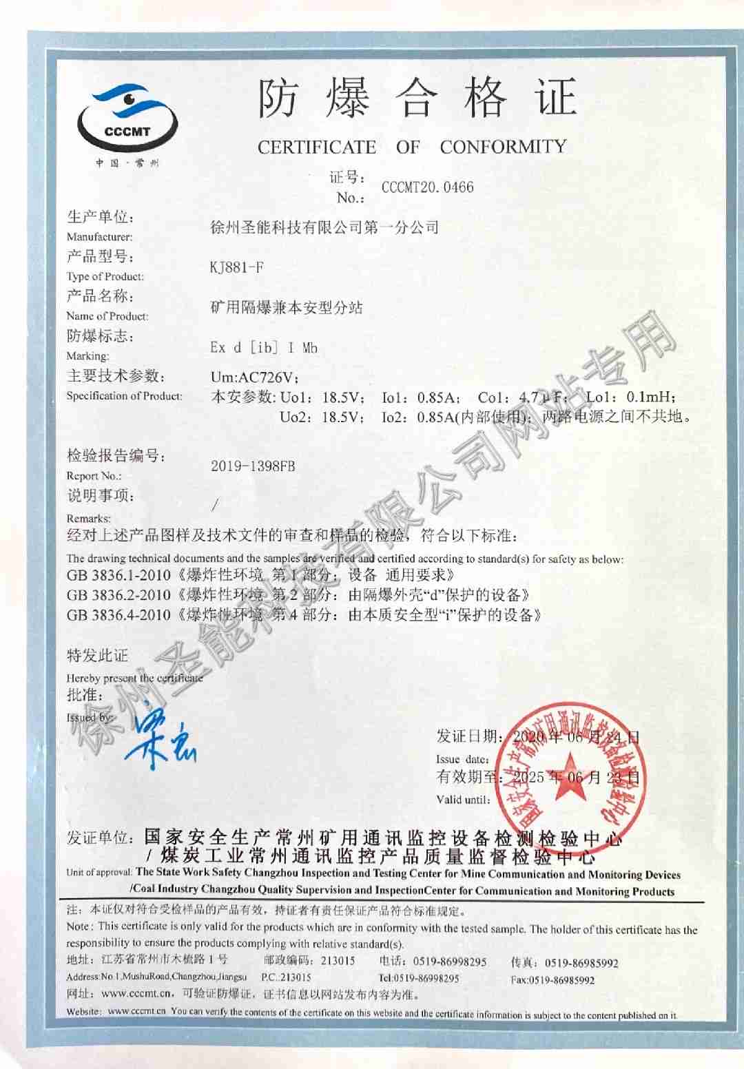 KJ881-F礦用隔爆兼本安型分站煤安證