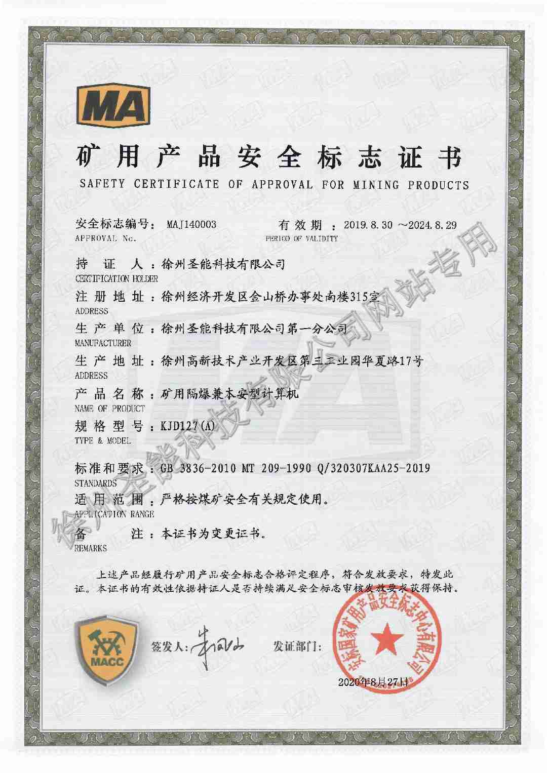KJD27(A)礦用隔爆兼本安型計(jì)算機(jī)防爆證