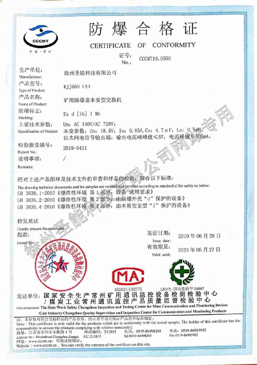 KJJ660(A)礦用隔爆兼本安型交換機煤安證