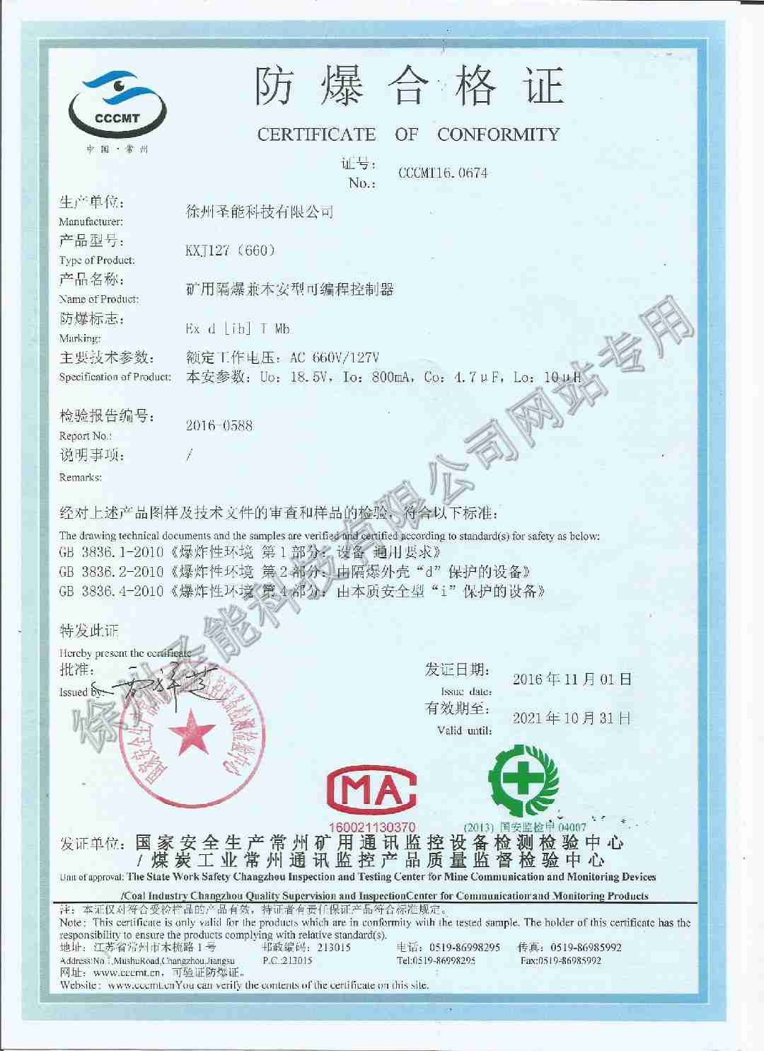 KXJ127(660)礦用隔爆兼本安型可編程控制器防爆證