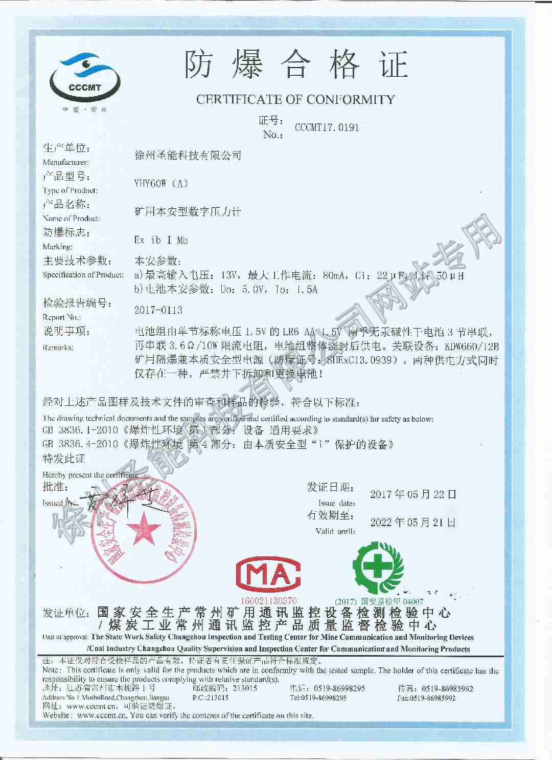 YHY60W(A)礦用本安型數(shù)字壓力計防爆證