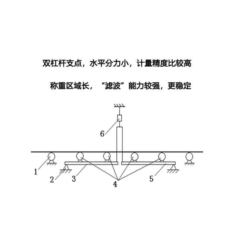 四托輥雙杠桿式結(jié)構(gòu)設(shè)計(jì),采用兩只拉式傳感器,外側(cè)支承采用無磨擦耳軸支點(diǎn),能夠有效克服偏載、坡度對(duì)精度的影響,環(huán)境適應(yīng)能力更強(qiáng)。