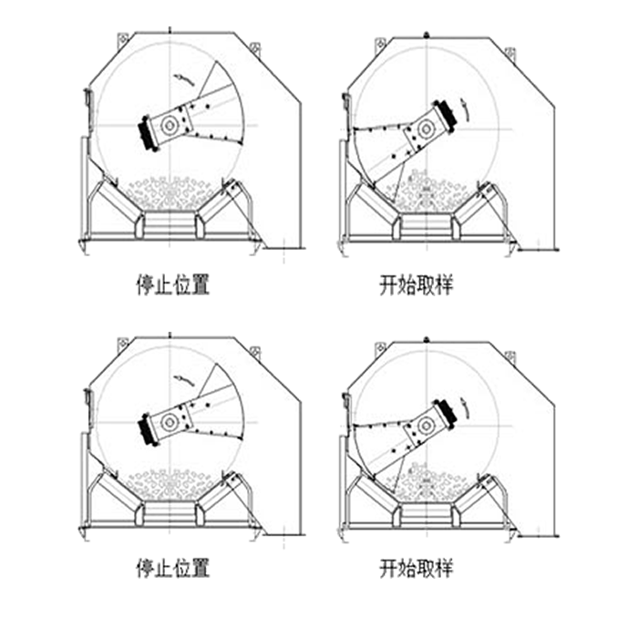 中部初級采樣機(jī)安裝在輸煤皮帶機(jī)中部,由PLC直接控制,按設(shè)定的時(shí)間間隔對皮帶機(jī)中部的物料進(jìn)行全斷面截取,所取物料經(jīng)溜槽進(jìn)入皮帶給料機(jī),皮帶給料機(jī)把物料均勻持續(xù)送入破碎機(jī),破碎機(jī)按照規(guī)定的粒度對物料進(jìn)行破碎,破碎后的物料通過縮分器進(jìn)行縮分,樣品被自動收集,最終樣品用于化驗(yàn)室水分樣和成分樣的測定,余料被返回到當(dāng)前運(yùn)行的皮帶中。該系統(tǒng)主要由中部采樣機(jī)、一級喂料機(jī)、破碎機(jī)、二級喂料機(jī)、縮分器、樣品搜集器等設(shè)備組成。